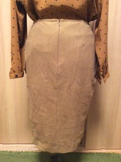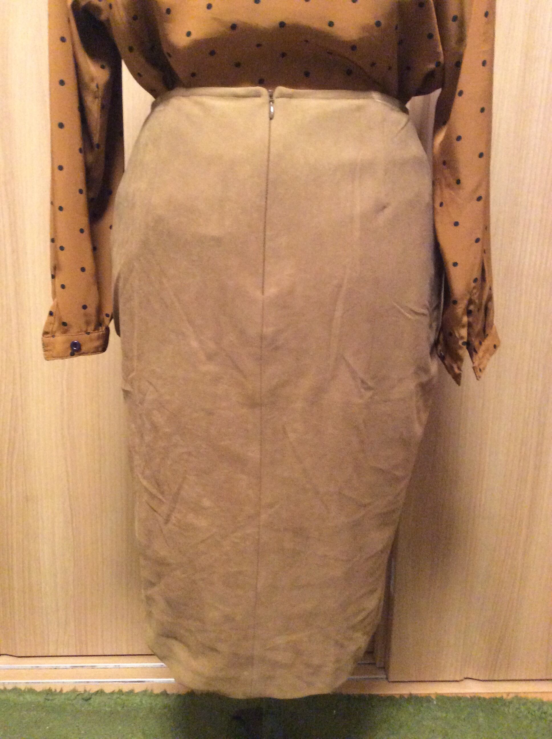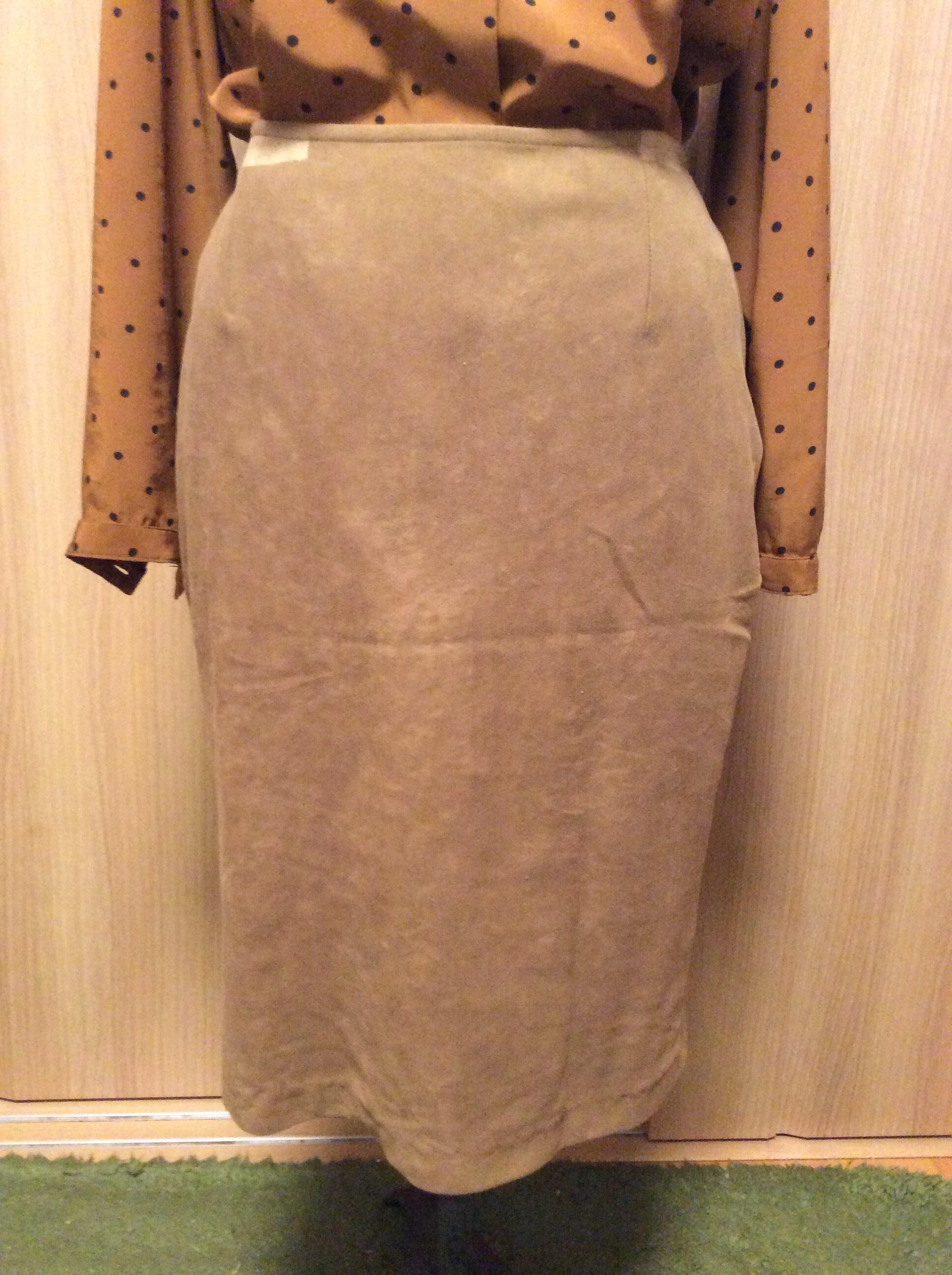 シンプルなベージュのタイトスカートは、ヌバックのような柔らかい素材で体のラインをきれいに演出してくれます。