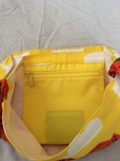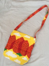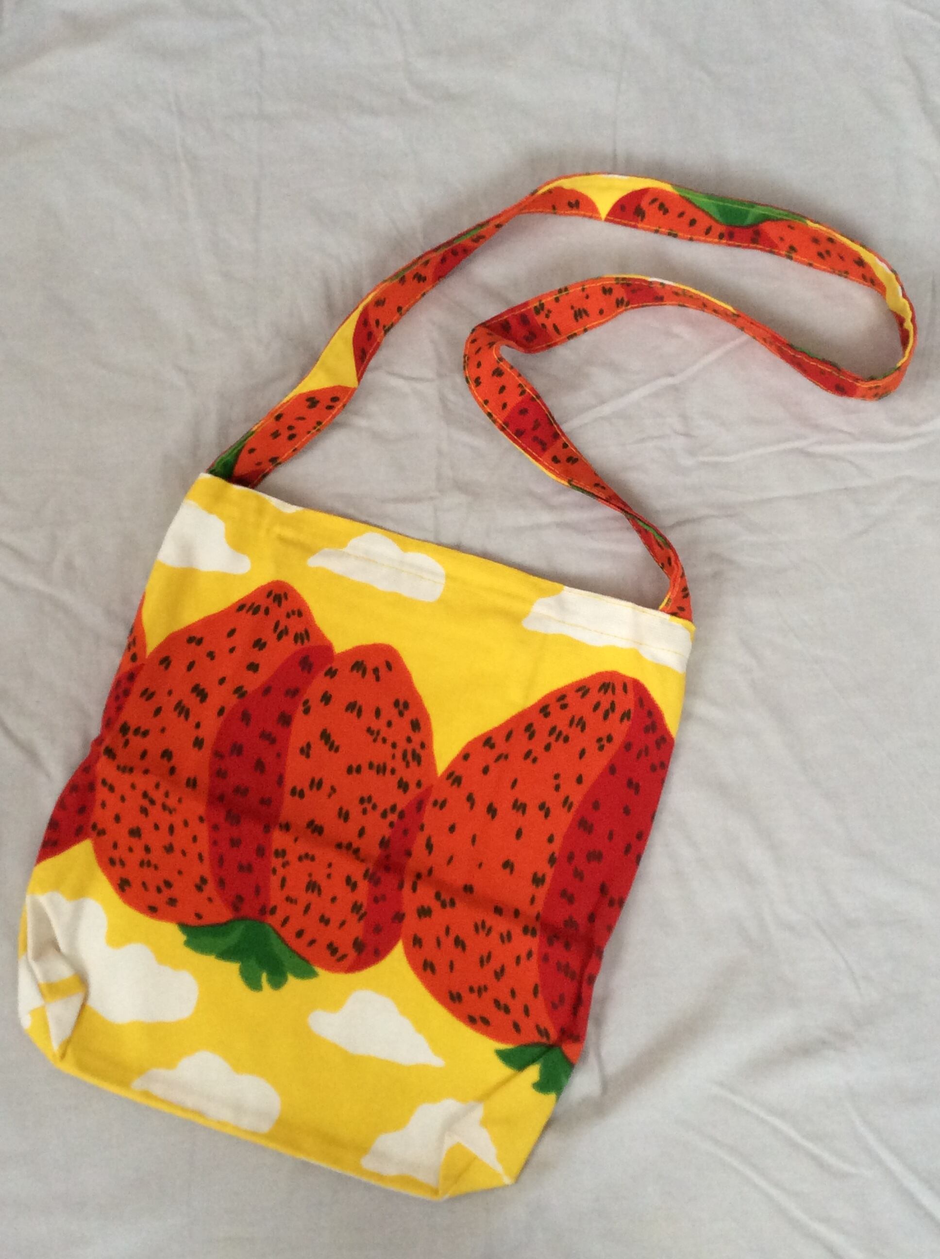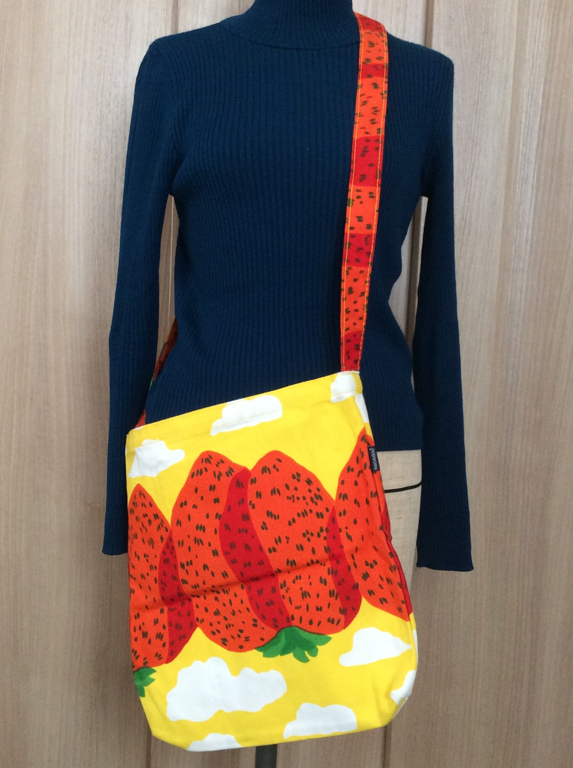 スエーデンで購入した、マリメッコのウニコ柄でも有名なデザイナー、MAIJA ISOLA が1971年にデザインした“MANSIKKAVUORET”(マンシッカ ヴォレット/ストロベリーマウンテンズ)柄の、厚手のキャンバス生地を使用したメッセンジャーバッグ。
